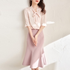 尚都比拉夏季减龄套装女飘带领短袖雪纺衫鱼尾半身裙时尚两件套 粉色 S