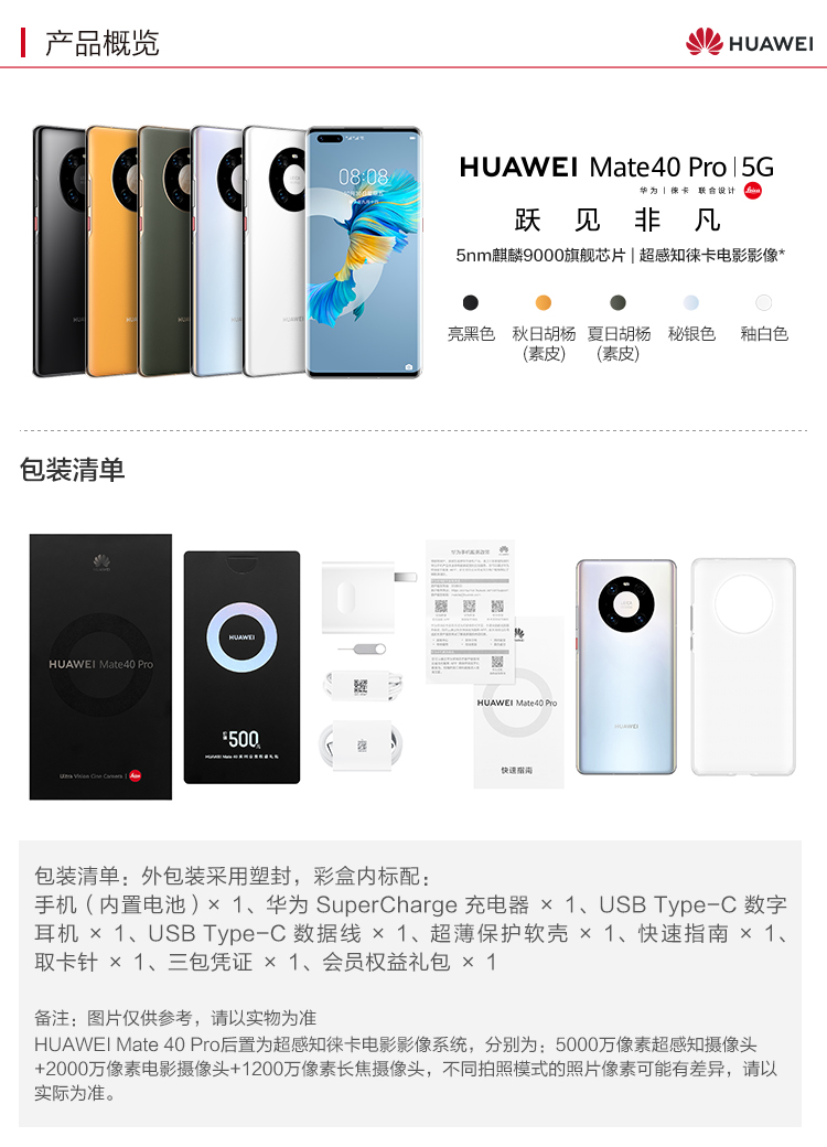 华为 HUAWEI Mate 40 Pro麒麟9000 SoC芯片 超感知徕卡电影影像 有线无线双超级快充8GB+256GB秘银色5G全网通